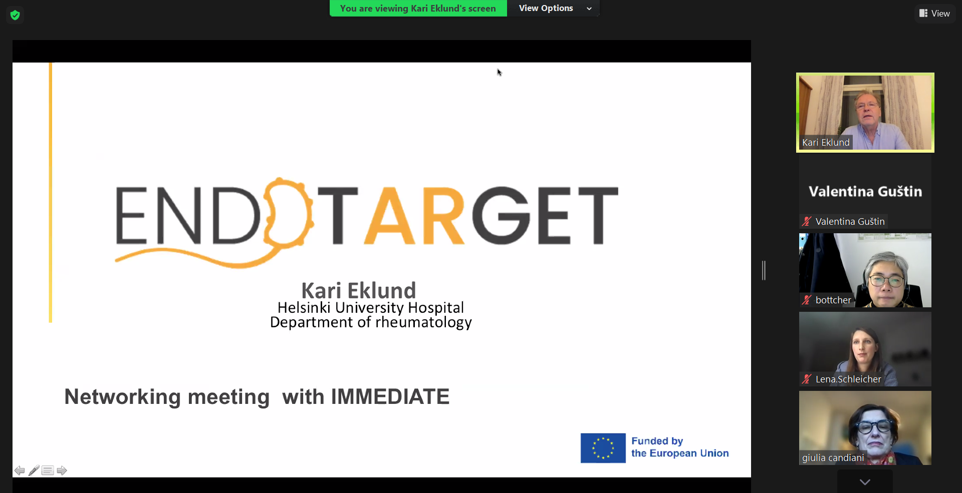 The coordinators concluded the meeting by outlining the upcoming steps in project management. Additionally, at the end of the meeting, Prof. Dr. Kari Eklund and Dr. Lena Schleicher, the project coordinator and project manager of our sister project, Endotarget, joined to share their progress. The exchange of insights during this segment provided valuable perspectives on addressing similar challenges encountered in both projects.