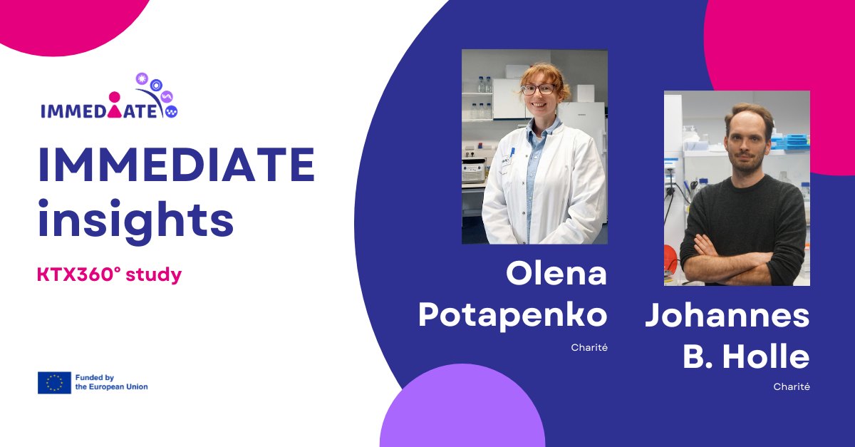 In the next IMMEDIATE insight, Olena Potapenko and Johannes B. Holle from Charité dive deeper into the KTX360° study. The KTX360° study is a multi-centre study conducted from 2018-2021 that followed patients after kidney transplantation. It is a part of work package 2 focused on unravelling shared and non-shared inflammation signatures in the transition from health to disease in the domains of metabolic, cardiovascular, kidney and brain functions.